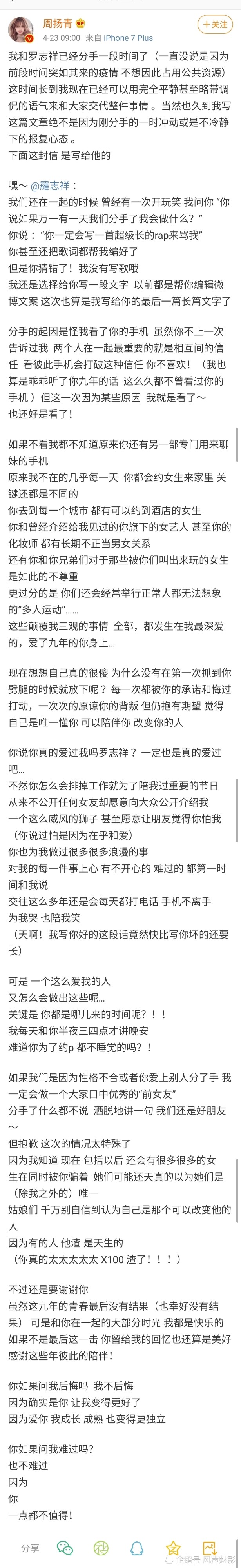 周揚青分手信全文: 嘿~ @羅志祥 : 我們還在一起的時候 曾經有一次開玩笑 我問你 「你說如果萬一有一天我們分手了我會做什麼?